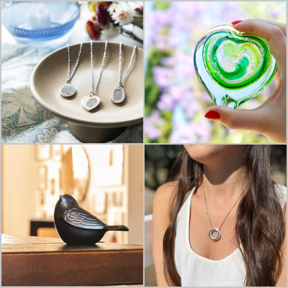 Our keepsake selection includes many beautiful customizable options ~ jewelry, colorful glass, small urns, and other memorable pieces that incorporate a portion of a loved one's cremated remains.